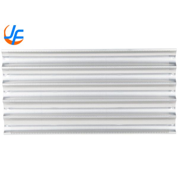 Provide customers with fresh-made French bread and baguettes with this aluminum baguette / French bread pan! Crafted from 16 gauge perforated aluminum, the Uni-Lock design of these pans provides support and a permanent connection between the frame and panel without using individual fasteners or welding. With no loose rivets to fall free and no broken welds to worry about, the Uni-Lock Baguette Pans provide hassle-free baking. Plus, its perforations allow for airflow and even cooking, and its aluminum construction provides superb heat conduction and transfer.