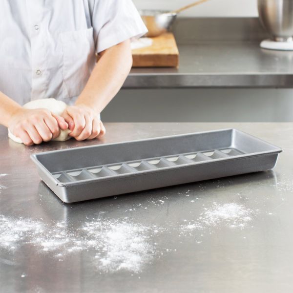 Whether you refer to them as New England Style Rolls or Lobster Rolls, the buns you produce with this pan will make your patrons feel just like they're eating a classic dog from the ballpark. Make top-loader buns which will hold your savory hot dogs securely, thereby reducing mess, and which will create the perfect hot dog meal eaten plain or with a mound of toppings! Arranged as one row with ten molds, you'll be baking those buns efficiently and productively.